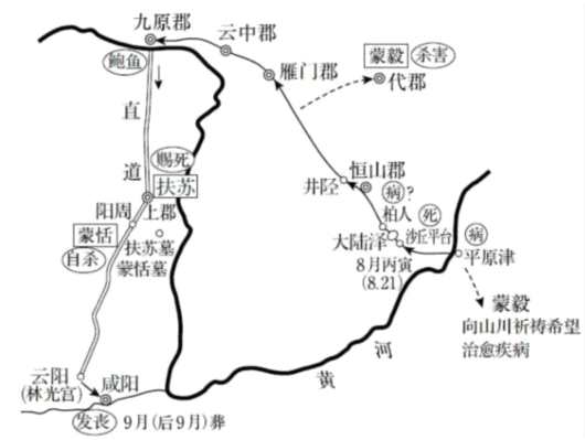 扶苏因在焚书坑儒时劝谏秦始皇而被贬到北边的上郡,负责监视指挥修建直道的蒙恬。秦始皇给扶苏所下遗诏的意思是:“把军队委托给蒙恬,到咸阳与我的灵柩相会,然后将我埋葬。”秦始皇大概已经意识到自己的病不可能捱到回咸阳。如果死在巡行途中,遗体要被送回咸阳。秦始皇的巡行路线是从北边的长城经直道回到咸阳。蒙恬和扶苏所在的上郡就在这条路线上,让他们赶到咸阳与死去的秦始皇相见并不是件困难的事情。
