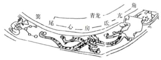 中国古代把太阳一年运行的轨道即黄道分为二十八星宿,作为观测太阳、月亮、五星(行星a)运动的坐标轴。东方天空有七宿,其中六个连起来的星像青龙一样浮在夜空中。龙的角为角宿,首为亢宿,胸为氐宿,腹为房宿,心脏为心宿,尾巴为尾宿。1987年西安交通大学校园内发现了一座西汉壁画墓,是一个官吏的小型墓。其中绘有一幅两千年前的色彩鲜艳的天文图,可以作为很好的参考。红色的太阳和银白色的月亮相对,太阳中有一只黑乌,月亮中有一只蟾蜍。在太阳和月亮之间有绿色、淡紫色交叠的祥云,像波浪一样,十几只仙鹤交错飞舞。沿着黄道上的两个圆圈上绘着二十八星宿图案。青龙(东)、白虎(西)、朱雀(南)、玄武(北)的四神形象隐藏在各自方向的星宿中。其他星座都是银白色的,只有青龙的心宿被涂成了红色,它也被称作“大火”。