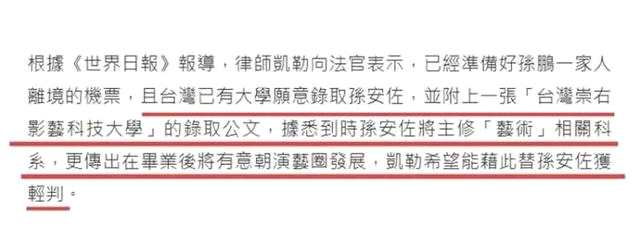 但继孙安佐“刑满获释”消息后,《世界日报》报道称,孙安佐的辩护律师在庭审中提供了一份录取通知书,显示孙安佐已被台湾崇右影艺科技大学录取,日后将主修“艺术”相关科系,将往演艺圈发展。
