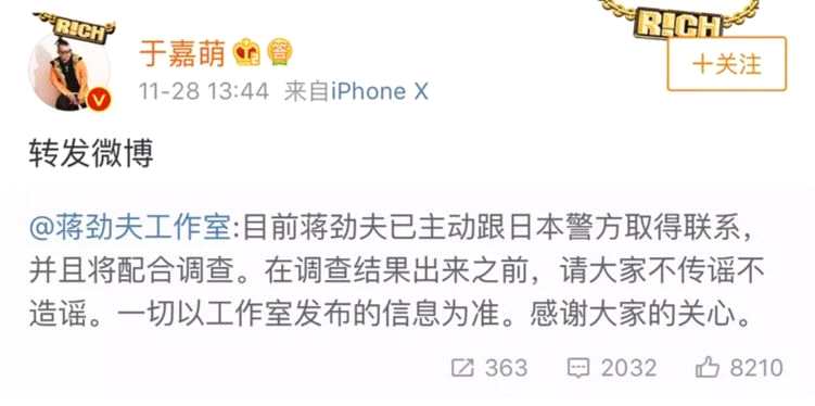 不过蒋劲夫的工作室依旧很坚挺,发微博说目前蒋劲夫已经主动跟警方取得联系,并且配合调查,希望大家在调查期间不要传不准确的消息。真是个爱岗敬业的工作室啊!