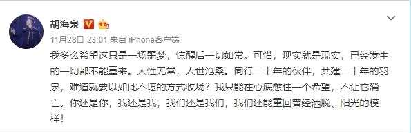 到了28日晚深夜,他再次发文,表示希望这只是一场噩梦,惊醒后一切如常,并希望羽泉还能重回曾经洒脱、阳光的模样。