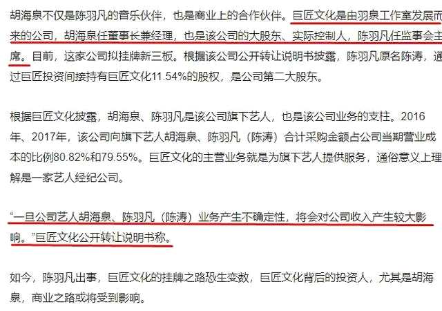 虽然在这个时候撇清关系有些不够厚道,不过也可以理解。因为胡海泉不仅是陈羽凡的音乐伙伴,也是商业上的合作伙伴,如今陈羽凡出事,恐怕双方都损失惨重。据报道,羽泉经纪公司“巨匠文化”由胡海泉担任董事长兼经理,而陈羽凡则是监事会主席兼第二股东。“羽泉”是该公司的业务支柱,一旦二人业务产生不确定性,将会公司收入产生较大影响,作为第一股东的胡海泉首当其冲。