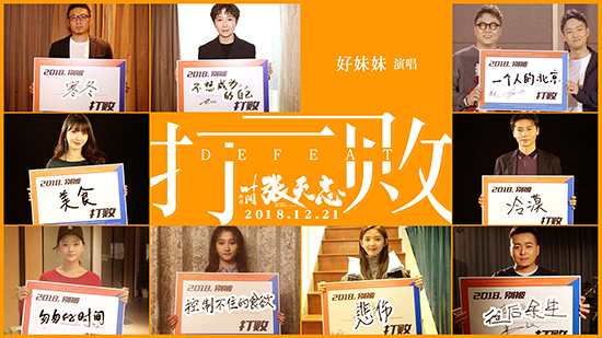 在《打败》情感视频中,“好妹妹乐队”的两位演唱者——秦昊、张小厚,和电影主创张晋、柳岩,演员关晓彤、任敏、章若楠等一道助力“2019不败力量”!作为电影《叶问外传:张天志》的主创,张晋、柳岩奉上暖心鼓励,希望每一位在12月21日到影院看片的观众都能从“张天志”的人生汲取力量,在生活中不被“冷漠”和“美食”打败,拥有战胜一切大小挑战和诱惑的非凡战斗力;演员关晓彤也同样温馨助力正在减肥的朋友们,不要被“控制不住的食欲”打败。导演苏伦、韩延鼓舞大家别被“不想成为的自己”和“寒冬”打垮、在2019要拥有战胜一切的力量,年轻演员任敏、章若楠也元气助力“2019不败力量”,希望大家能够不被“匆匆的时间”打败、不被“悲伤”打败,抛开忧虑烦恼、做自己的英雄。马良身为音乐人更是以“歌名”传情,送上不被“往后余生”打败的鼓励;作为《打败》的演唱者,“好妹妹乐队”的秦昊、张小厚,以不被“一个人的北京”打败收尾,给身在外乡为梦想打拼、奋斗的人们赠予了前进的力量! “凡人英雄”张天志传递“2018不败力量” “最强功夫阵容”扞卫中国功夫永不言败 在这支《打败》情感视频中,最打动人心的画面莫过于近20位普通人的勇敢剖白。视频里,来自不同地方、出生于不同时代、从事不同职业、拥有不同身份性别的近20位普通人勇敢面对镜头,写下了有关2018的最大遗憾,和2019的最新希冀:期望不被“孤单和艰苦”打败,能够“有人并肩战斗”的职场新人;发誓不再被“懒惰”打败、争取拿下雅思的备考青年;手握车把争分夺秒只希望不被“投诉”、“催单”打败的快递、外卖工作人员;被父母深深牵挂、期待能签约最好模特公司的靓丽女孩;渴望能和家人来一次海岛旅游,战胜“工作、家务”牵绊的年轻妻子;寒夜里风餐露宿想要“一个温暖家”的流浪汉;还有无论阴晴雨雪仍坚守岗位、只求“服务更多人”的车站调度员……无论是要跟自律抗争、从“练出马甲线”、彻底“戒烟”的生活习惯开始,还是要打败“迷茫”、活出“更值得人间”的鸿心壮志,2018的这个冬天,生活中每一个普通人这些平淡而又实际的梦想,都让人倍感窝心和动容。 而作为一部“武星云集”、集结了中外最强武打阵容的功夫巨制,电影《叶问外传:张天志》虽讲述了一名“咏春英雄”的传奇故事,但这位英雄张天志身上,却更能看到很多身为普通人的一面。在这里,不仅能看到咏春功夫的博大精深,更能看到一个“失意英雄”的重新崛起:在惜败同为“咏春传人”的叶问之后,张天志曾一度心灰意冷,决意永远放下功夫,以普通人的身份度过余生,但“乱世终究不容英雄做凡人”,在经历了一系列跌宕起伏的考验后,他才发现“真正的放下是勇敢面对”,重拾梦想与热情,才能拥有不被打败的力量。相较于以往影视作品中完美的英雄,战无不胜的英雄,曾有过失败的“凡人”张天志,更能给同样在生活中深陷困惑的普通人带来心灵抚慰。面对2018年即将远去的离愁别绪,勇敢前行,是打败不舍与遗憾的最好办法,这也正是电影最新宣传曲《打败》要告诉影迷的道理:“我们奋不顾身去闯,去拥抱的蓝天。”2018年末咏春将归、武魂重燃,跟张天志一起打破2018遗憾,迎接2019新生、永不言败,做自己的英雄! 电影《叶问外传:张天志》将于12月21日登陆各大院线,全国预售已火热开启,武行正道、咏春归来,敬请期待!