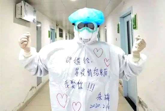 还有一位未婚男医生,把自己对恋人的承诺写在了防护服上面,病人看了是一份温暖,恋人看了是一份安心,写字的人肩挑的却是一份沉甸甸的责任!
