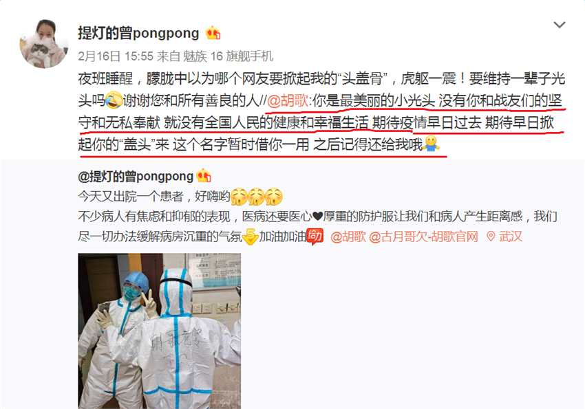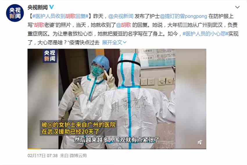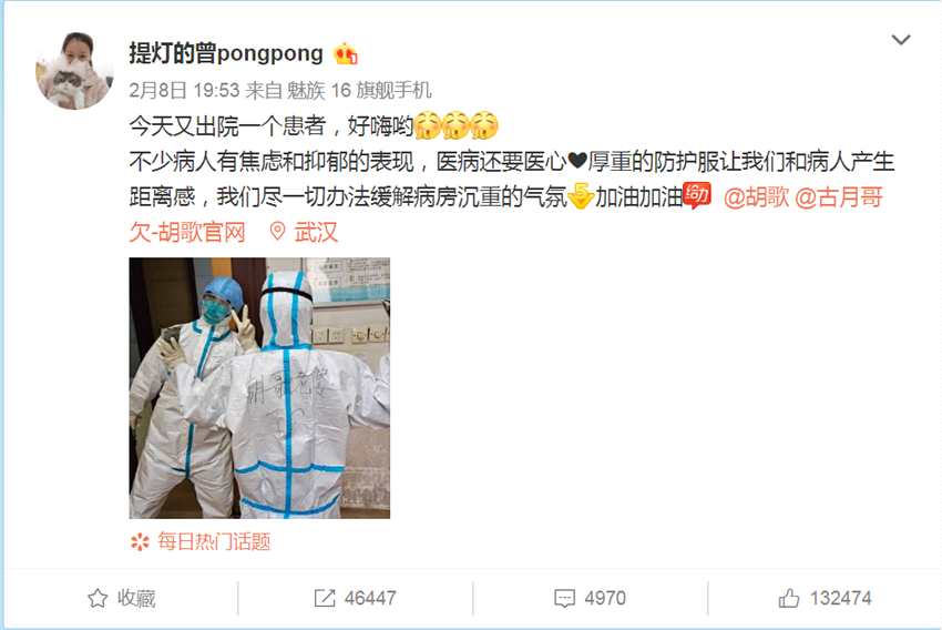 根据事后了解,这位小护士是在年初三由广州赶赴武汉的,在医院里她负责的是重症病区域,为了能够让精神压力巨大的患者放松心态,她直接把爱豆“胡歌”的名字写在防护服上,以此来逗患者开心。