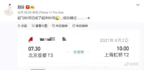 4月2日,演员刘芸在微博晒出“生活糗事”,自己错把飞机起飞时间当成了起床时间,完美错过了从北京飞往上海的航班。