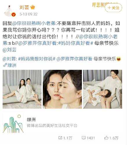 面对微博中有网友出言不逊,刘芸极为愤怒告诫网友:“不要随意抨击别人的妈妈,如果我骂你妈你开心吗?你再骂一句试试!姐绝对让你说的话付出代价!”不少网友也力挺刘芸。