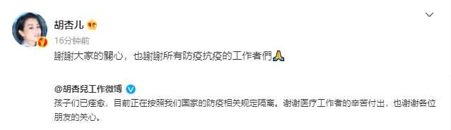 3月25日,胡杏儿工作室发文回应此事,称:“孩子们已痊愈,目前正在按照我们国家的防疫相关规定隔离。谢谢医疗工作者的辛苦付出,也谢谢各位朋友的关心。”随后,胡杏儿也转发表示:“谢谢大家的关心,也谢谢所有防疫抗疫的工作者们。”