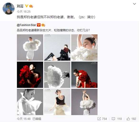 5月9日报道 今日,刘芸的最新时尚大片释出,时尚博主在文案中称刘芸为郑钧老婆,“品品郑钧老婆最新杂志大片,松弛慵懒的状态,你打几分?”随后刘芸转发回应写道:“我是郑钧老婆但我不叫郑钧老婆,谢谢。”可以说是很耿直了!